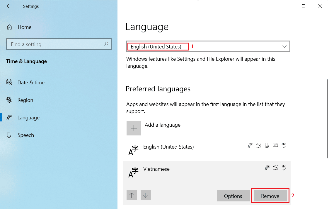 Qua phần Language -> chuyển Language sang English (United States) và click Remove tại gói ngôn ngữ Tiếng Việt (Vietnamese) để gỡ bỏ nó.