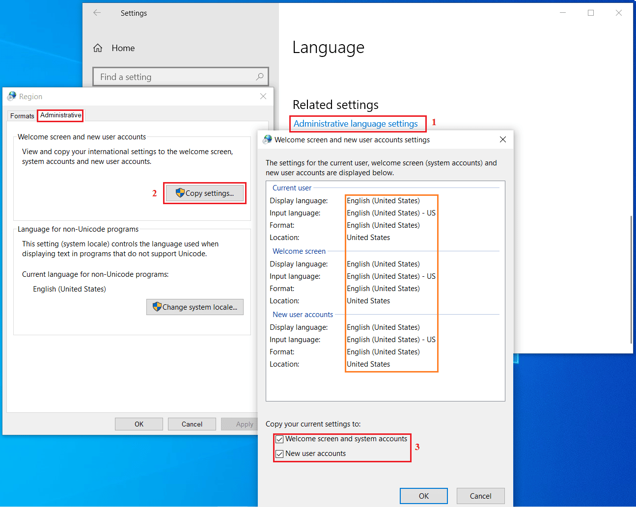 Kéo xuống bên dưới, click vào dòng chữ màu xanh Administrative Language Settings (1) để sao chép cài đặt ngôn ngữ (2) cho tất cả người dùng cục bộ trên máy (check 2 dòng mục (3)) -> nhấn OK