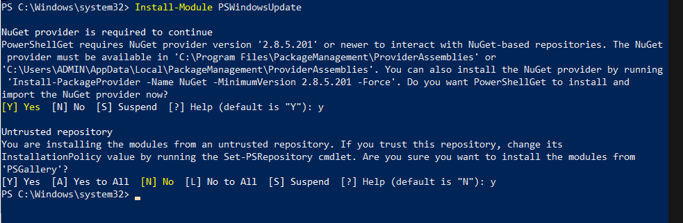 • Chạy dòng lệnh sau để cài đặt Windows Update module