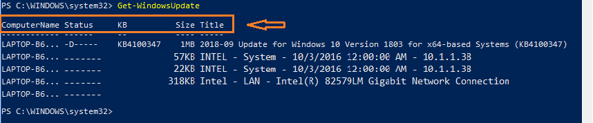 Lệnh Get-WindowsUpdate sẽ hiện danh sách những bản cập nhật với số hiệu KB- (KBnumber), dung lượng (Size), tiêu đề (Title) của bản cập nhật.